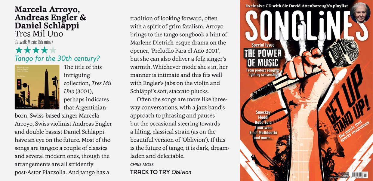 Das britische Musikmagazin «Songlines» hat das neue Album «Tres Mil Uno» besprochen. «Arroyo brings to the tango songbook a hint of Marlene Dietrich-esque drama... but she can also deliver a folk's singer warmth.» Muchas gracias für die wunderbare Kritik!