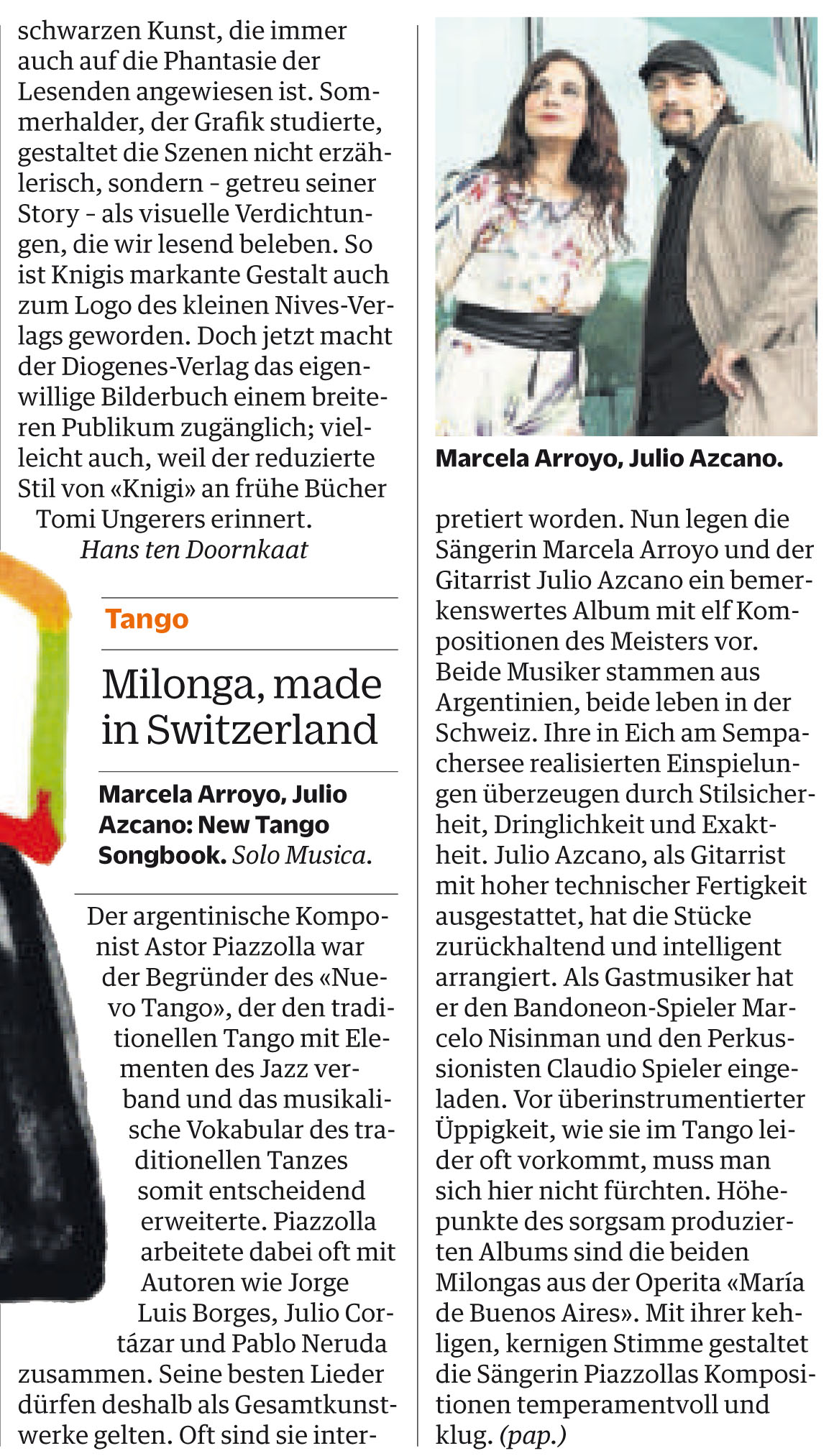 «Reducir al máximo - auf das Maximum reduzieren» - Diesem Prinzip folgt die aus Argentinien stammende, in der Schweiz lebende Sängerin Marcela Arroyo. Mit einem minimalistisch angelegten Instrumentarium gibt sie der Tangomusik eine starke Stimme. Den überzeugenden Beweis lieferte sie im Kulturhof Köniz.» Luca D'Alessandro