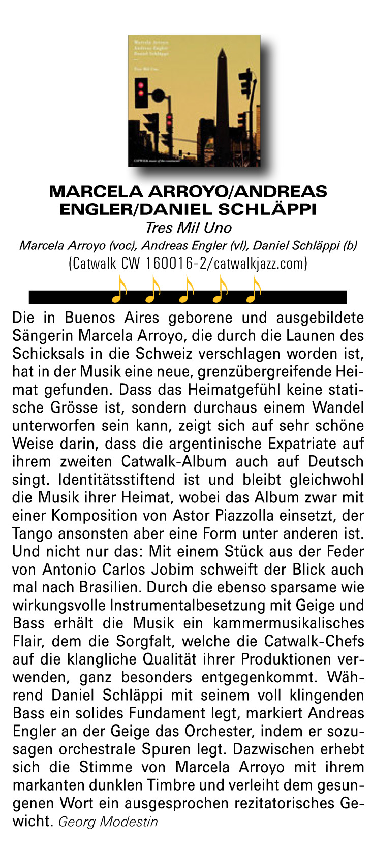 «Die in Buenos Aires geborene und ausgebildete Sängerin Marcela Arroyo… hat in der Musik eine neue, grenzübergreifende Heimat gefunden. Dass das Heimatgefühl keine statische Grösse ist, sondern durchaus einem Wandel unterworfen sein kann, zeigt sich auf sehr schöne Weise darin…» George Modestin